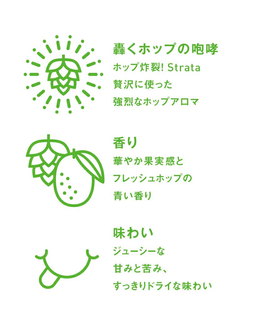 白濁した外観とトロピカルジュースのようにフルーティーでジューシーな香りと風味、苦みを抑えた柔らかな飲み心地が特徴です。